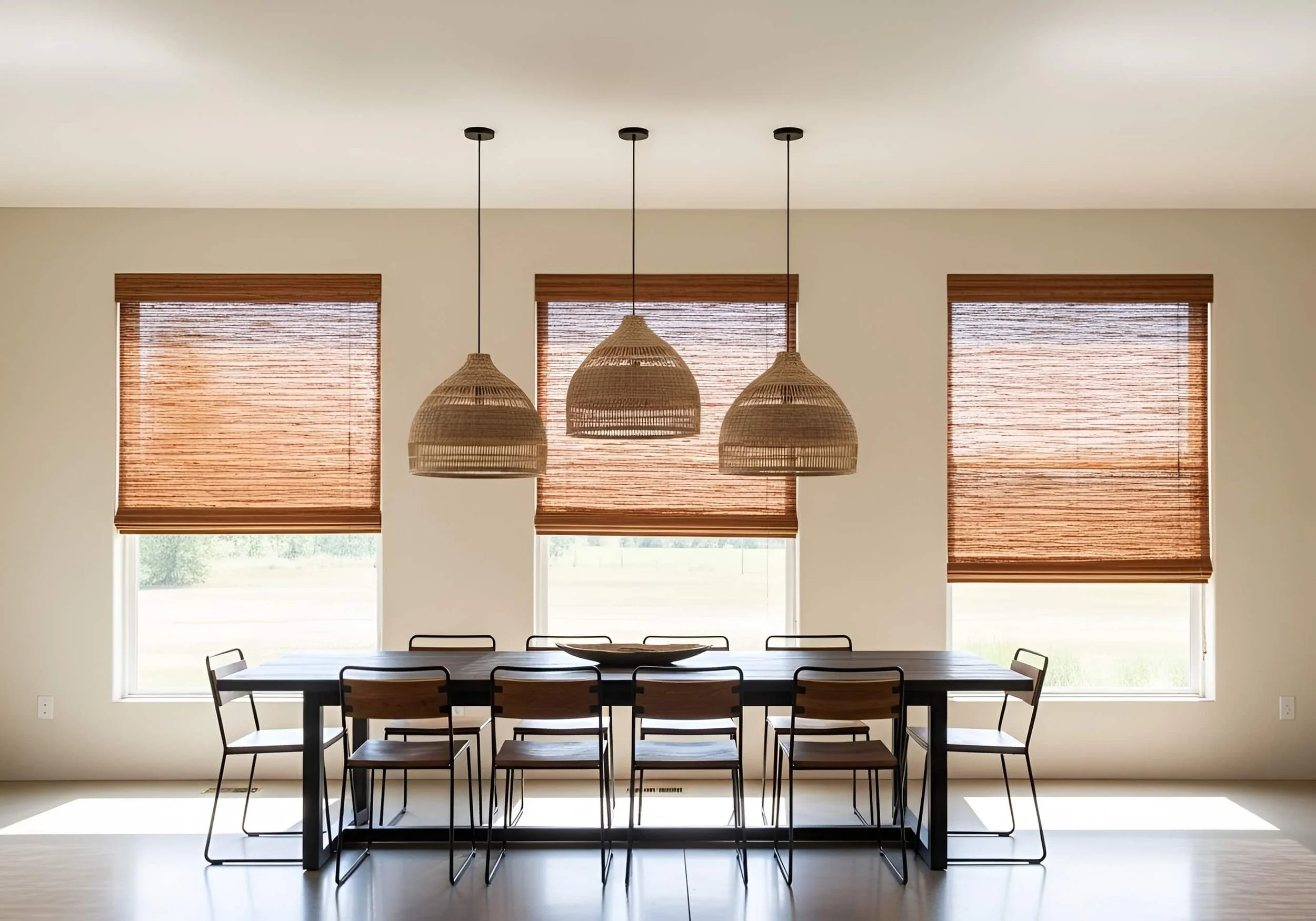 Woven wood shades add organic texture and sophisticated style while providing functional light control. Real bamboo materials create depth and visual interest that synthetic fabrics cannot replicate. These are the shades clients choose when they want their windows to make a design statement.