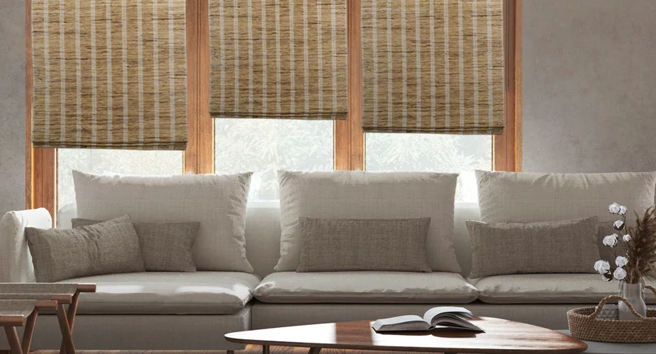 Bamboo reeds are woven into panels that fold elegantly when raised. The natural material filters light beautifully while maintaining privacy. Each shade has distinct grain patterns and color variations that prove its authentic construction.