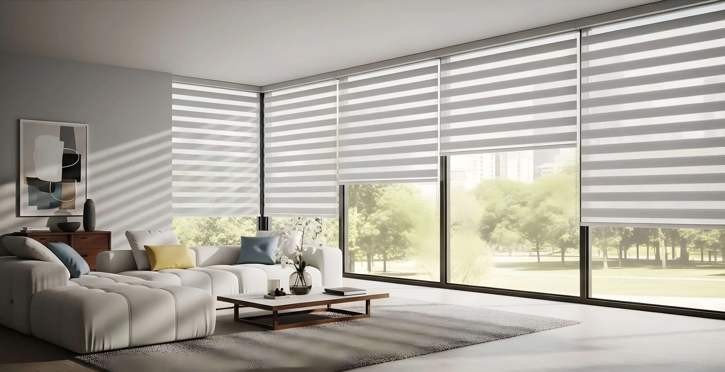 Zebra shades deliver precise light management through alternating sheer and solid fabric stripes. Align the stripes for soft filtered light, offset them for privacy, or raise the shade completely for unobstructed views. One window treatment that adapts to how each room is being used throughout the day.